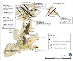 Drill hole TOM21-004 encountered strong zinc-lead-silver dominant mineralization (Garpenberg-style) at the Oscarsgruvan zone, and holes TOM21-005 to -012 encountered variable grades and widths of zinc-lead-silver and copper-gold dominant mineralization (classic VMS-style) at the Steffenburgs zone with the following drill assay highlights: