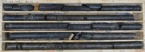 Hole TOM21-012 stepped west 50 m from drill hole -011 with an angled orientation (-70° dip) to the southeast (140° azimuth) and was designed to test below the -200 m level exploration drift. The beginning of this hole is dominated by fine grained hanging wall volcanic ash silt-sandstones with varying biotite/phlogopite content. A transition to more chaotic qtz>phl/muscovite altered felsic volcanic rock/schist starts at 260.0 m with abundant cordierite blasts observed at 266.0 m. A zone of intense Mg-alteration starts at 270.0 m with chaotic cordierite, anthophyllite, phlogopite, chlorite assemblages and a chlorite-talc interval from 282.0 to 293.0 m. Mineralization (pyrite-gahnite up to 5%, plus local magnetite blasts) starts at 293.0 m in dark-grey chaotic qtz>chlorite>cordierite>anthophyllite altered felsic volcanic rock. Intense veining of pyrrhotite>pyrite>chalcopyrite, typical for ‘feeder conduits’ is noticed from 309.0 to 324.0 m. The Mg-alteration/ qtz>chlorite>anthophyllite>cordierite altered felsic rock stops at 335.0 m by an intruding, younger, mafic dyke. The last meters of the drill hole are dominated by more volcaniclastic looking rock until the end of hole depth at 356.0 m.