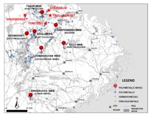 • Boliden’s Garpenberg Mine is located 60 km to the southeast, and the historic Falun Mine is located 30 km to the east. Lundin’s Zinkgruvan Mine is located 190 km to the south.