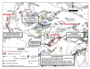 The advanced exploration stage Tomtebo Property is located in the Bergslagen Mining District of south-central Sweden is the Company’s main focus. Tomtebo comprises 5,144 ha and is situated between the historic Falun Mine and Boliden’s Garpenberg Mine that are located 25 km to the northwest and southeast, respectively. Two historic polymetallic mines and numerous polymetallic showings are located on the Tomtebo Property along an approximate 17 km trend that exhibits similar geology, structure, alteration and VMS/SedEx style mineralization as other significant mines within the district. Mineralization that is open at depth and along strike at the historic mines on the Tomtebo Property has not been followed up on, and modern systematic exploration has never been conducted on the Property.