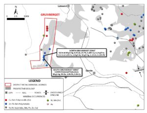 • The Gruvberget Property comprises a 208 ha core mineral license that covers the North and South zones.  The 5,078 ha enclosing mineral license is in the application process, and contains numerous polymetallic showings that have not seen modern systematic exploration.