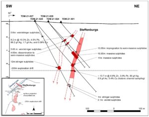 - Wide and high grade polymetallic mineralization encountered: Hole TOM21-028 intersected 30.4 m of continuous intense sulphide mineralization (143.6 to 174.0 m) including 13.55 m of impregnation to semi-massive sulphides (143.6 to 157.15 m), and 16.85 m of massive sulphides (157.15 to 174.0 m) at the Steffenburgs zone (Figure 1).