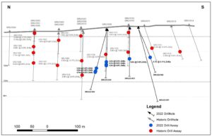 A long section is shown in Figure 1, and drill assay results are shown in Table 1. Drill hole summaries are reported here.