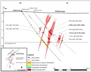 - Polymetallic sulphide lens extended 40 m below hole TOM21-025 at the Steffenburgs zone: Hole TOM22-038 intersected massive sulphide mineralization over approximately 2.7 m (271.5 to 274.2 m). This was an approximate 40 m step out below hole TOM21-025 which returned 14.3 m at 14.2% ZnEq1 from 210.0 to 224.3 m (Figures 1 and 2).