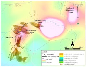- Footwall polymetallic mineralization encountered at Steffenburgs zone: Hole TOM22-038 intersected intermittent disseminated, stringer, and impregnated with lesser semi-massive to massive mineralization over approximately 61.5 m (210.0 to 271.5 m). The significance of this footwall mineralization will be determined by geochemical assay results and with continued step out drilling at depth (Figures 1 and 2).