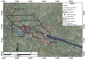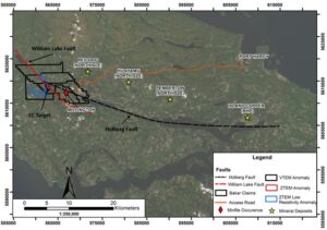 - Target located within a corridor of low magnetic response that correlates with the convergence of the crustal scale William Lake and Holberg Faults, which is an ideal setting for a porphyry copper or volcanogenic massive sulphide (VMS) mineralized system.