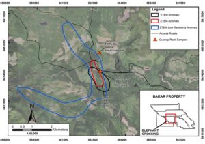 February 7, 2022 – District Metals Corp. (TSX-V: DMX) (FRA: DFPP); (“District” or the “Company”) is pleased to provide an update on the Bakar Property located on Northern Vancouver Island, British Columbia (Figure 1). In August 2020, Sherpa II Holdings Corp. (TSX-V: SHRP) (“Sherpa II”) entered into an agreement to acquire an 80% interest in the Bakar Property by cash payment, the issuance of shares, and work expenditures (August 18, 2020 news release) where exploration work was operated by District Metals who retains a 20% interest in the Bakar Project. Recent exploration work on the road-accessible Bakar Property has identified a large and high priority target, named Elephant Crossing (EC), which is defined by strongly altered adjacent host rocks coincident with geochemical and geophysical anomalies (Figure 2).