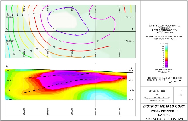 The MobileMT survey covered approximately 1,391 line kilometers at 400-meter line spacing across the Tåsjö Property. The high-priority target areas were selected based on the shallow depth and thickness of the interpreted Alum Shale. The Alum Shale is typically flat-lying, and is rich in graphite and sulphides, making it low resistivity (highly conductive) and easy to detect using the airborne MobileMT system.