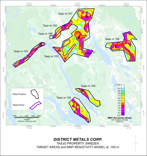 The high resolution MobileMT survey results, covering approximately 34,300 hectares at the Tåsjö mineral licenses nr 101 to 108 has successfully outlined eight low resistivity (highly conductive) anomalies (Target Areas A to H in Figure 1) consistent with the MobileMT signature observed at the Company’s Viken Deposit as reported in District’s news release of September 24, 2025. These results represent a major step forward in District’s strategy to delineate drill-ready targets within a largely underexplored region characterized by Alum Shales enriched in vanadium, potash, uranium, molybdenum, nickel, zinc, copper, and rare earth elements (REEs).