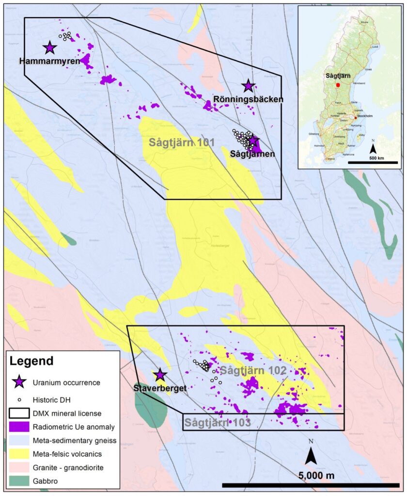 Multiple companies historically explored the Sågtjärn area for base- and precious metals. This includes the Staverberget area with copper, molybdenum, and gold enriched boulders that assayed from background levels to 1.3% Cu, 1.8% Mo and 1.3 g/t Au hosted by metamorphosed, fine-grained mica-rich sediment-gneiss. Follow-up drilling in 1982 (987 m in 7 drill holes) intersected a 0.8 m mineralized interval with 1.46% U3O8, 1.26% Mo, 0.25% Pb, 0.2% Zn, 0.2% Cu, 10 g/t Ag5. The drill results can be found in the Geological Survey of Sweden (SGU) database: https://www.sgu.se/en/products/geological-data/. Drill results have been converted from U to U308 (U308=U*1.1792).
