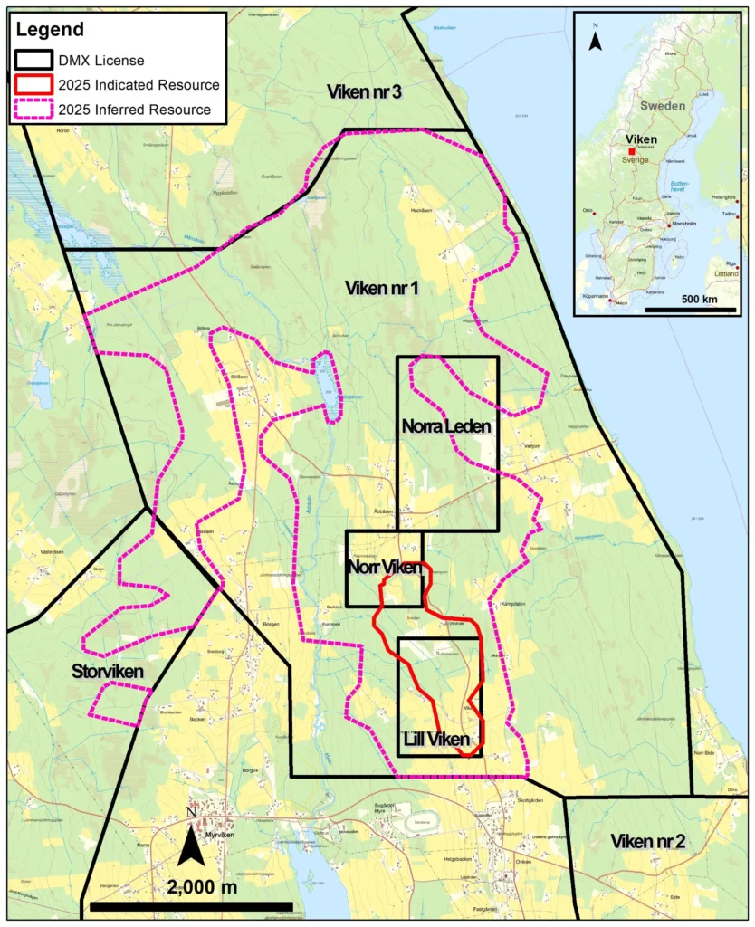 The Viken Property totals 38,657 hectares (ha) where the Viken nr 1 mineral license covers the majority of the Viken Deposit. The Norra Leden, Norr Viken, Lill Viken mineral licenses cover the southeast and east areas of the Viken Deposit that remain open to the south and east based on historic drill results.